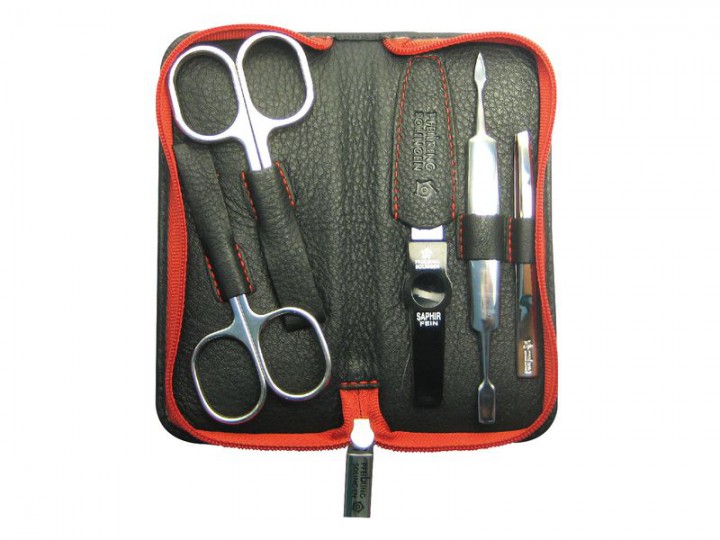 PFEILRING Maniküre-Etui, 5-teilig, Nappaleder, schwarz, mit auffälligem rotem Reißverschluss. Reißverschlussetui, gefüllt mit einer rostfreien schrägen Pinzette, einer Saphirfeile mit grober und feiner Körnung, einer rostfreien Nagel- und einer Hautschere sowie einem rostfreien Ganzstahl Doppelinstrument zum Zurückschieben der Nagelhaut und zum Reinigen der Nagelunterkante. Ein Etui, das keine Wünsche offen lässt. Made in Solingen, Germany.