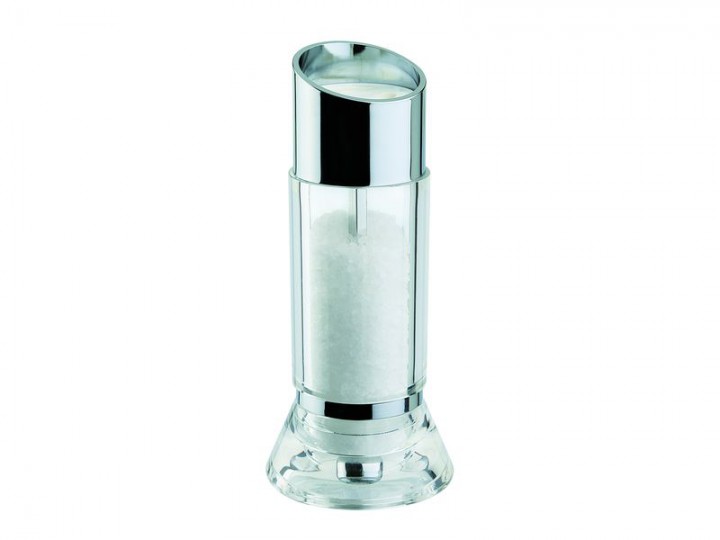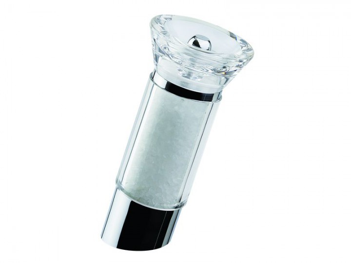 David Mason Design Salzmühle, Upside, transparentes Acryl, verchromtes Oberteil, Polyacetal-Mahlwerk, gefüllt
