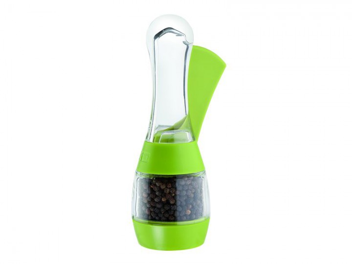 Überraschen Sie Ihre Gäste mit dieser einhändig zu bedienenden Pfeffermühle "Triga" von David Mason Design. Anstatt zu drehen wird das stufenlos verstellbare Keramik-Mahlwerk durch Drücken des seitlichen Hebels in Bewegung gebracht. Das Gehäuse aus grünen Kunststoff- und transparenten Acrylelementen ist auch optisch ein echter Blickfang. Geliefert wird die bereits gefüllte Mühle in einer attraktiven Kunststoff-Geschenkverpackung.