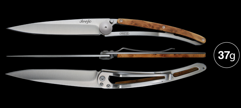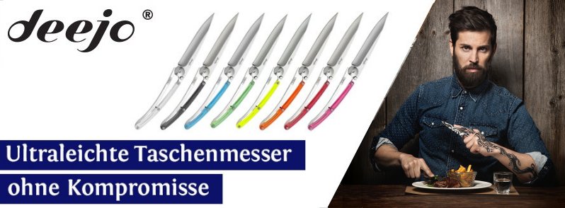 Deejo sind die ultraleichten Taschenmesser ohne Kompromisse bei der Größe für jeden Tag. Deejo hat bereits in der früheren Bezeichnung „Baladéo G-Series“ den begehrten “Industry Award“ auf der Outdoor im Jahre 2010 gewonnen – und startet jetzt mit noch größerer Produktvielfalt als eigenständige Marke. Ausgestattet mit einer arretierbaren Klinge aus 420er-Stahl und in den Varianten „NAKED“ (Edelstahlheft), „WOOD“ (Edelstahl/Holz-Auflage) und COLORS (Edelstahl/Polycarbonat-Auflage) kann man unter 14 Modellen auswählen.