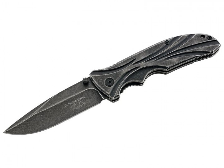 Ganz in Stonewashed-Optik präsentiert sich dieses komplett aus Stahl gefertigte Einhandmesser aus dem Hause Herbertz. Dank beidseitig montierter Daumenpins lässt sich die Klinge aus dem rostfreien Hochleistungsstahl AISI 420 schnell in Arbeits-Position schwenken, und ein Liner Lock übernimmt die sichere Arretierung. Fantasievoll gestaltete Edelstahl-Griffschalen sorgen für zusätzliche optische Akzente und lassen das Messer satt in der Hand liegen. Ein Gürtelclip rundet die Ausstattung ab.