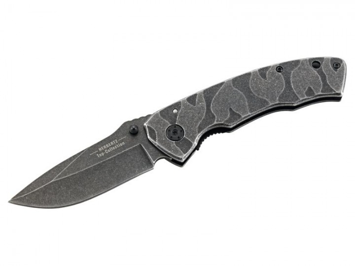 HERBERTZ Top Collection Einhandmesser, AISI 420-Stahl, Edelstahl-Griffschalen, Stonewashed-Optik, Nylon-Etui, Box