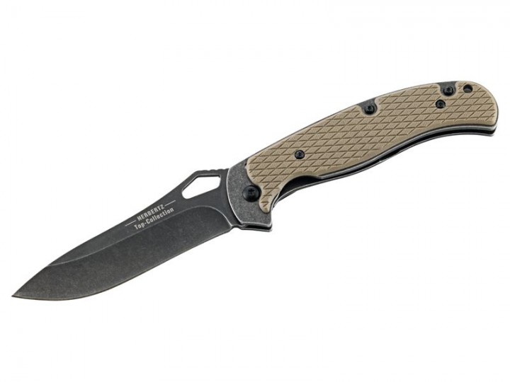 HERBERTZ Top Collection Einhandmesser, AISI 420-Stahl, Stonewashed-Optik, G-10 Griffschalen, Nylon-Etui, Box