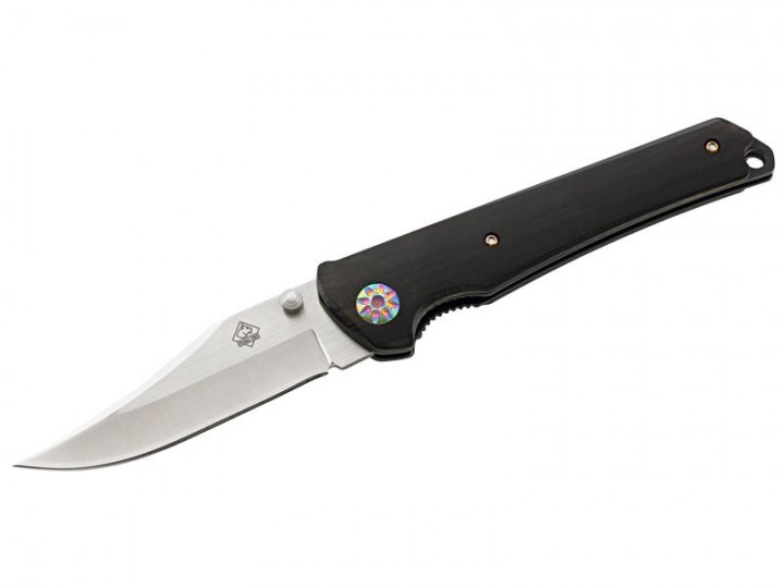 Der Einsatz von dunklem Ebenholz in Verbindung mit einer hellen Klinge wirkt immer elegant, so auch bei diesem Puma TEC Modell. Der leichte Gang beim Öffnen und Schließen, ein Muss für ein Einhandmesser, ist hier hervorragend gegeben. Zum Arbeiten lässt sich die Klinge durch einen Linerlock sicher arretieren. Für die schlanke Klinge in Hechtform wurde D2 Carbonstahl verarbeitet, eine Stahlart, die für ihren hohen Härtegrad bekannt ist. Einen optischen Leckerbissen bilden die in Regenbogenoptik gehaltenen, Griff-, Klingen- und Clipschrauben.