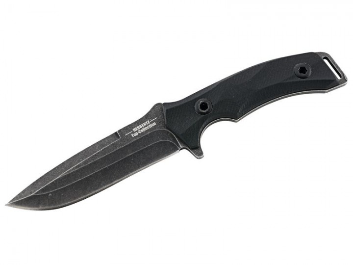 Ein echtes Herbertz TOP-Collection Gürtelmesser. Die 12,5 cm lange Klinge präsentiert sich in moderner "stonewashed" Optik. Die Klinge ist aus einem durchgehenden Stück rostfreien AISI-420 Stahl gefertigt. Auf dem Klingenrücken befindet sich eine gefräste Daumenauflage, über welche die Kraft auf die Schneide gut übertragen werden kann. Die Heftschalen sind aus G-10 Material gefertigt und bieten einen sicheren Halt beim Gebrauch des Messers. Zum Lieferumfang gehört eine Lederscheide inklusive Gürtelschlaufe und eine gepolsterte TOP-Collection Kunststoff-Box.