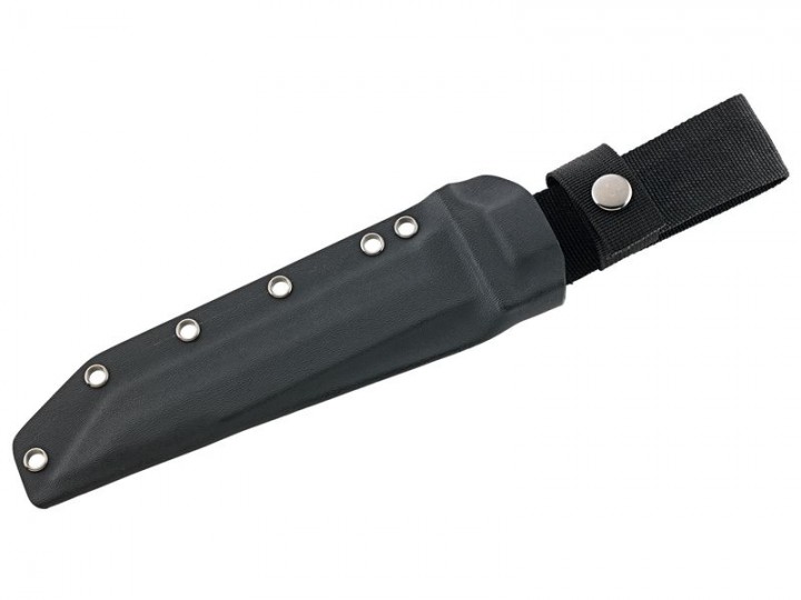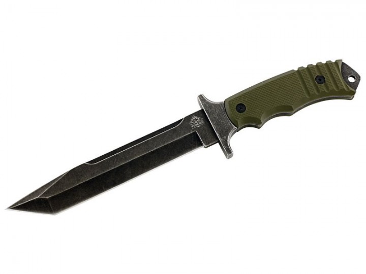 Ganz im Military-Look präsentiert sich dieses Puma TEC Gürtelmesser. Die wuchtige Tantoklinge aus rostfreiem AISI 420 Stahl im "stonewashed" Finish schreckt vor keiner Aufgabe zurück. Die griffigen, ergonomisch geformten Heftschalen aus olivgrünem G10 und das ausgeprägte Parierelement sorgen für ein sicheres Handling. Das Griffende ist mit einer Fangriemenöse ausgestattet und kann als Glasbrecher eingesetzt werden. Eine Kydex-Scheide mit Nylon-Gürtelschlaufe rundet die Ausstattung ab.
