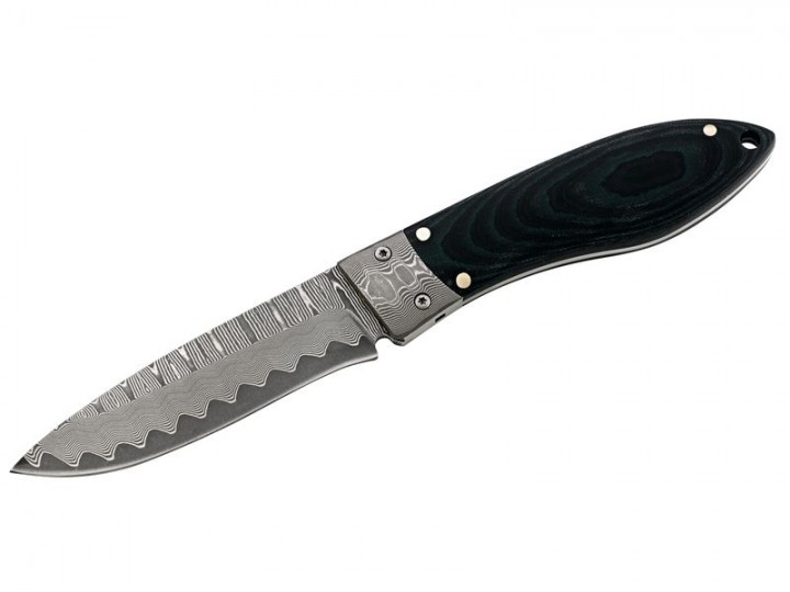 Dieses elegante Gürtelmesser aus der Puma TEC Serie ist mit einer sehr schön gezeichneten,ß67-lagigen Damaszenerklinge in Drop Point Form ausgestattet. Für das Heft kommen Griffschalen aus grün-schwarz gemasertem G10 und Damaszenerbacken zum Einsatz. Eine solide Scheide aus schwarzem Leder ist im Lieferumfang bereits enthalten.
