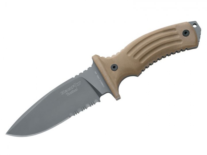 Dieses BlackFox Gürtelmesser stammt aus der taktischen Serie der italienischen Firma FOX. Das robuste, aufgrund der Olivfärbung von Griff und Scheide, militärisch anmutende Modell ist ein solides Allzweckmesser, das auch im härteren Einsatz zu überzeugen weiß. Die kräftige, am Rücken 5 mm starke Klinge verfügt über eine Teilsägezahnung und ist aus rostfreiem Stahl 440 produziert und, dem taktischen Gesamtdesign entsprechend, matt sandgestrahlt. Sauber eingepasste Griffschalen aus G10 sorgen, zusammen mit einem großzügig bemessenen Parierelement, für den nötigen Halt beim Arbeiten. Die Molle kompatible Cordurascheide birgt im Inneren einen soliden Kuststoffeinsatz, der einem Durchstechen beim Einstecken vorbeugt und gleichzeitig die Klinge beim Transport sicher schützt.