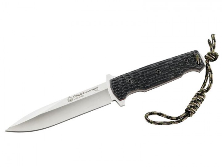 Das kräftige Outdoor-Messer Chispero aus der Puma IP Serie macht vor keiner Herausforderung halt. Das Messer aus rostfreiem AN.58 Stahl mit Spear Point Klinge ist durch die massive Full Tang Bauart und einer Rückenstärke von 5.3 mm besonders robust ausgelegt. Die Griffschalen aus strukturiertem, grauem Micarta bieten auch großen Händen genügend Platz und sorgen, in Kombination mit Fingermulden und dem Parierelement, für sicheren Halt. In der doppelten Fangriemenöse ist bereits eine Sicherungsschnur befestigt. Im Lieferumfang ist eine sauber verarbeitete, schwarze Lederscheide mit abnehmbarer Vortasche incl. Feuerstarter enthalten.