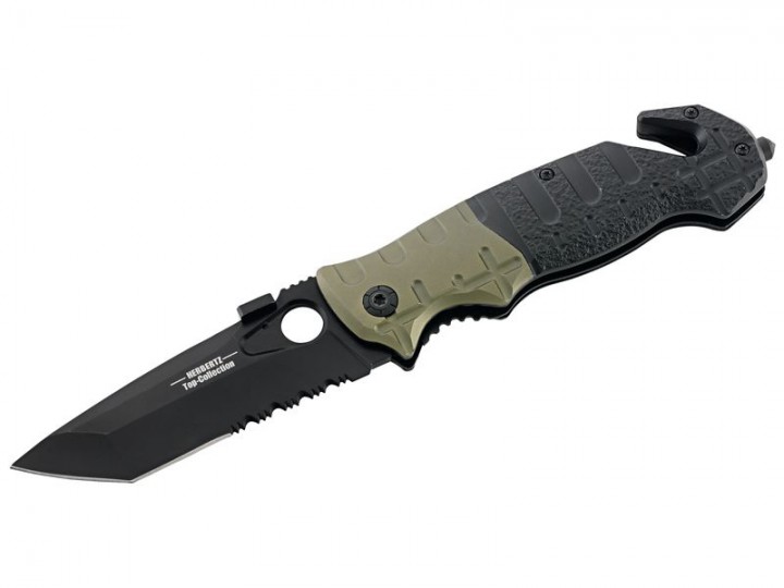 Mit einer schwarz beschichteten Tantoklinge aus dem Hochleistungsstahl AISI 440 und einer zweifarbigen Heftgestaltung mit Griffschalen aus Aluminium liefert dieses Rettungsmesser aus der Herbertz TOP-Collection einen überzeugenden Auftritt. Die aufgeschraubte kleine Platte auf dem Klingenrücken dient als Daumenpin sowohl für Links- als auch für Rechtshänder und sorgt für eine schnelle Einsatzbereitschaft des Messers. Ein Liner Lock übernimmt die sichere Arretierung der Klinge in geöffneter Position. Teilsägezahnung, Gurtschneider und Scheibenzertrümmerer sind zur Stelle, wenn es drauf ankommt. Die Lieferung erfolgt inklusive schwarzem Nylon-Etui und gepolsterter Kunststoffbox.