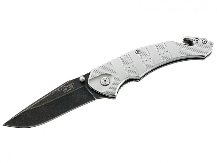 Herbertz-Rettungsmesser, Stahl AISI 420, Liner Lock, Aluminium-Griffschalen, Glasbrecher, Gurtschneider, Clip
