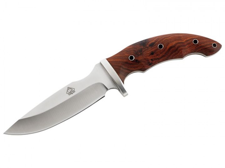 Diese feststehende Messer aus der Puma TEC Serie wird mit einer Drop-Point Klinge in Full Tang Bauweise aus rostfreiem AISI 420 Stahl hergestellt. Ausgeprägte Fingermulden geben der Arbeitshand festen Halt und sorgen in Kombination mit dem Edelstahl-Parierelement für sicheres Arbeiten. Für die Griffschalen kommt schön gemustertes Rebenholz zum Einsatz. Das Messer wird mit einer braunen Lederscheide geliefert.