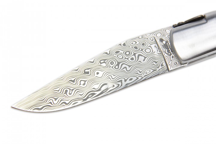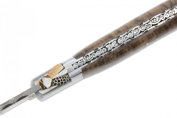 Ein Sportmesser aus der Fertigung von Fontenille Pataud mit Griffschalen aus Walnussholz und einer Klinge aus 120lagigem Rosendamast mit einer Rückenstärke von 3,5 cm und 56-57 HRC. Zahlreiche dekorative Verzierungen an Rückenfeder, Fliege und Platinen machen das Messer zu einem individuellen Unikat.