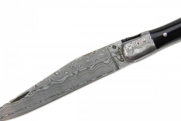 Ein Modell des Typs Laguiole Traditional aus der Fertigung von Fontenille Pataud mit Griffschalen aus Büffelhorn und Beschlägen aus Damaststahl. Die Klinge ist gefertigt aus 120-lagigem Rosendamast und bietet 56-57 HRC. Zahlreiche dekorative Verzierungen an Rückenfeder, Fliege und Platinen machen das Messer zu einem individuellen Unikat.